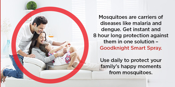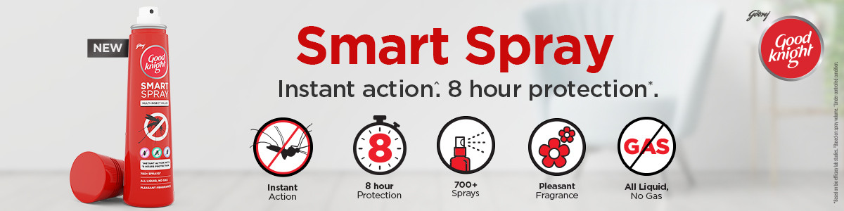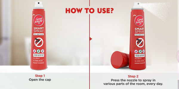 - This spray provides instant and 8-hour long protection from all mosquitoes. It has a mild and pleasant fragrance that avoids causing irritation. Good knight Smart Spray can be used in the corners of the room, under the sofa/bed, behind the curtains etc. Now get rid of mosquitoes instantly and protect your family from diseases like malaria, dengue, etc.