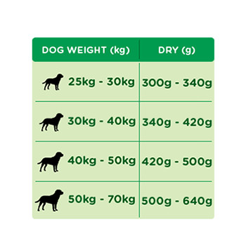• Dog’s weight (25 kg-30 kg): 300g-340g/day