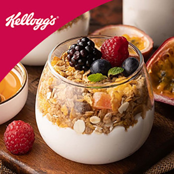 Ingredients: 100g of Kellogg's Muesli with 21% Fruit & Nut, 100g frozen coconut Yoghurt, 15g jaggery powder, 10g chia seeds, Fresh passion fruit puree, For garnishing: Fresh raspberries & blueberries, 1 Passion Fruit, 5 ml Honey