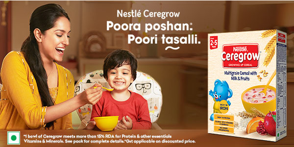 Ensuring that there is no nutrition gap including all Vitamins and Minerals is crucial in these early years. Our cereal Nestle CEREGROW is a kids development food that helps to tackle fussy eating/ picky eating behavior in kids and helps in regular growth and development of your little one. A bowl of CEREGROW is made with the goodness of Multigrains, Milk and 5 fruits(Apple, Mango, Pomegranate, Orange and Blackcurrant).