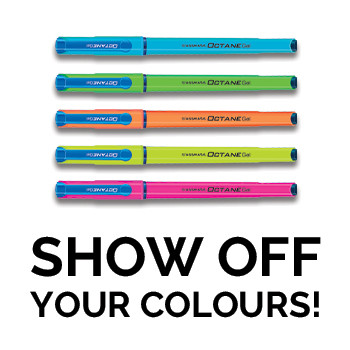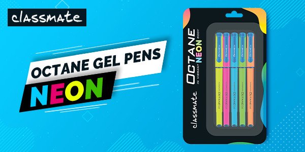 Classmate Octane gel - neon pens, come in 5 flashy vibrant body colours with Japanese waterproof ink for smooth and fast writing. The textured rubber ensures a perfect grip. The low viscous blue ink ensures a smooth writing experience. Designed to give comfort for neat writing experience without any hassle.