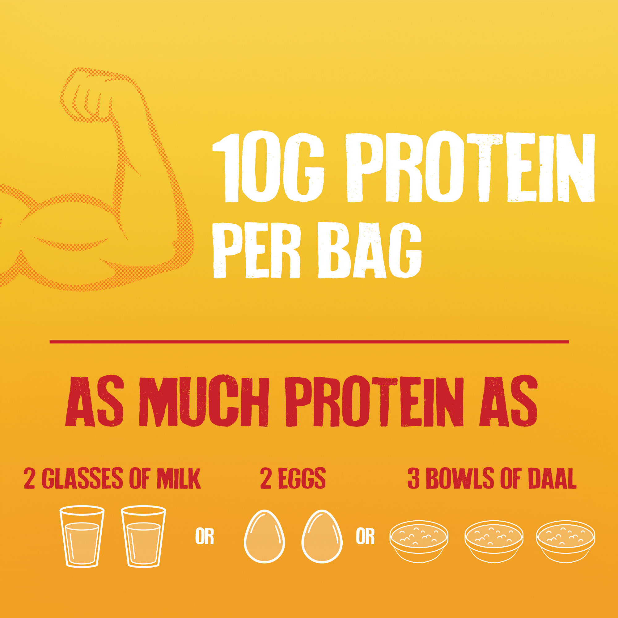 With 10g of protein per bag, our puffs give you as much protein as 2 glasses of milk, 2 eggs, or 3 bowls of daal and are also a great source of fiber.