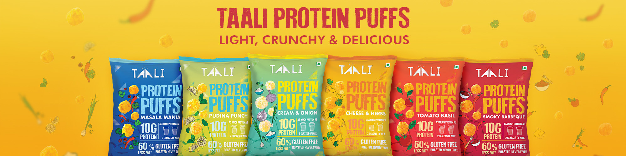 Taali’s Protein Puffs are a revolutionary snack, combining the goodness of super grains like Jowar, Chickpeas, Lentils, and Soy into a delicious puff. They are slow-roasted to perfection for that extremely crunchy experience that gives you the goodness of protein with every bite, making them the ideal chatpata snack.