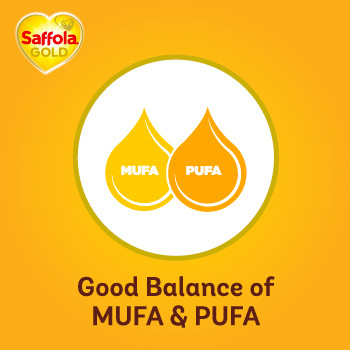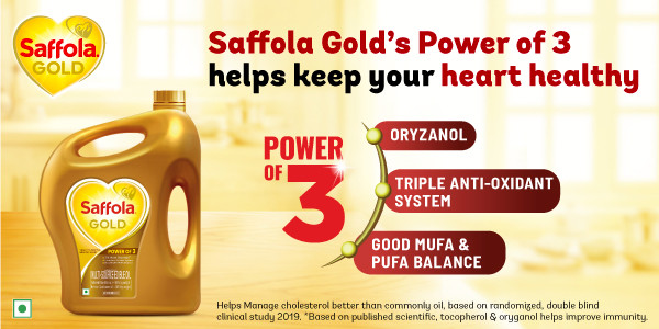 Saffola Gold comes with Power of 3 – Oryzanol that helps maintain cholesterol, Triple Anti-oxidant System that helps improve immunity and Good MUFA & PUFA balance for better nutrition through fats.