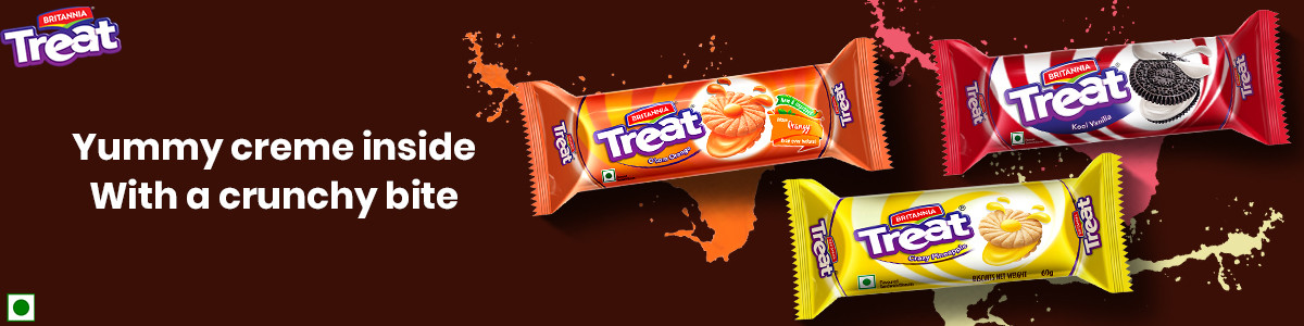 Britannia Treat is a range of yummy and mouth-watering biscuits relished by everyone. Lickable cream sandwiched between crispy layers of biscuits, it is a treat that everyone wants to enjoy for sure. Available in so many lip-smacking flavours and cool shapes. The Treat biscuits are everyone's favourite.