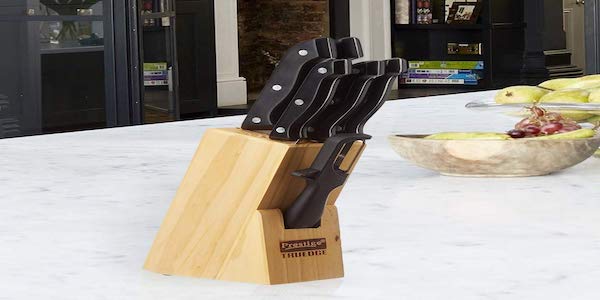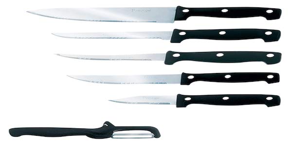 The right set of kitchen knives can make a huge difference and save valuable cooking time. If you understand the need to use the best tools to achieve precision cutting in the kitchen, you will love the convenience of the Prestige Tru-Edge kitchen knife set. It features five multi-purpose knives and a free peeler with a wooden block for storage. The high-quality serrations in these knives ensure extra sharpness for your chopping, dicing, and slicing needs. Stylish and practical, the Prestige Tru-Edge set includes all the knives you would need, including a paring knife, a boning knife, and a chef’s knife.