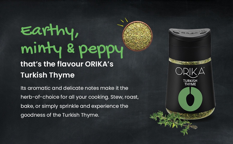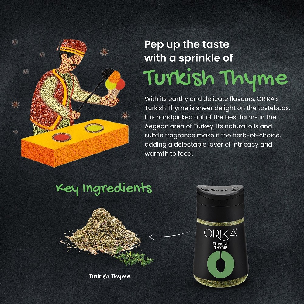 Orikas Turkish Thyme is handpicked from the Aegean region of Turkey, known for the worlds finest quality of Thyme. It has a high content of natural volatile oil. This herb conveys a soft and subtle aroma with a slightly minty flavour.