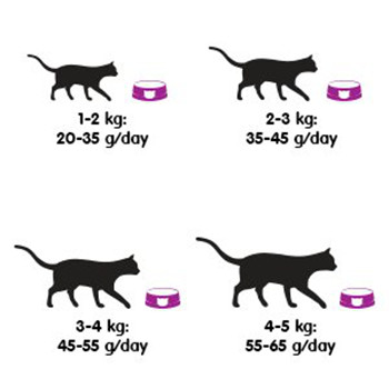 - Cat’s Weight (1-2 kg): 20-35 g/day.