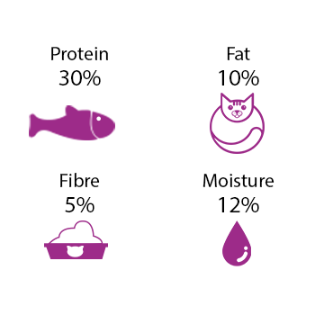Contains 30% Protein, 10% Fat, 12% Moisture and 5% Fibre.