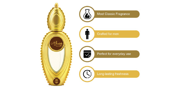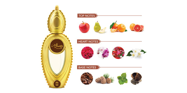 Cast in a magnificent gilt-edged bottle, Wisal Dhahab is the new Mukhallat spray from the house of Ajmal. The fragrance opens with Fruity Fresh top notes embellished with Apple, Peach, Pear, Grapefruit, and Mandarin. At its Heart, the essence engulfs Floral highlights of Rose, Jasmine, Orchid, and Geranium. And to complete the sheer experience of the journey, the Base Notes are Woody Musky resonating with Sandalwood, Cedarwood, Patchouli, and Musk. Wisal Dhahab is a fragrance that is perfectly crafted for those who wish to add an extra touch of gold and shimmer to their personal.