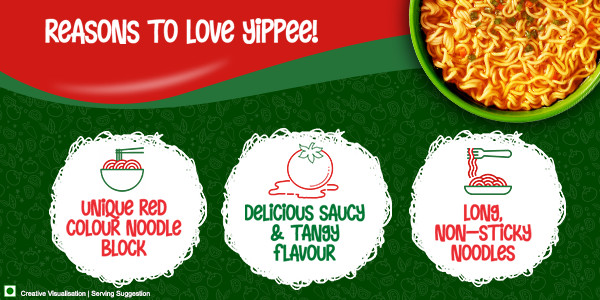 Instant noodles with long, non-sticky noodle strands to get you slurpy noodles every time. YiPPee!'s signature round block but in red colour! A delectable blend of masalas infused with tomatoes, and goodness of real veggies. Savour the saucy and tangy flavour of instant noodles. Ready to eat in 3-4 mins & easy to prepare - Add saucy masala tastemaker for a quick saucy noodles meal with a chatapata flavour. The perfect hot snack for those who like their delicious bowl of noodles with a tangy twist