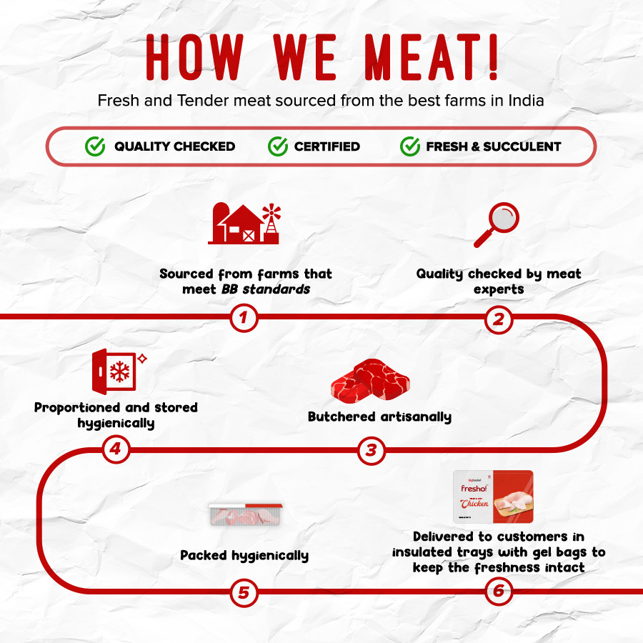 Fresho Meats is our in-house brand of fresh meat, poultry, and seafood. We take utmost care in selecting the best suppliers to provide you with high quality and succulent products. Every product is stored in our cold storage right until your doorstep ensuring freshness and utmost hygiene.