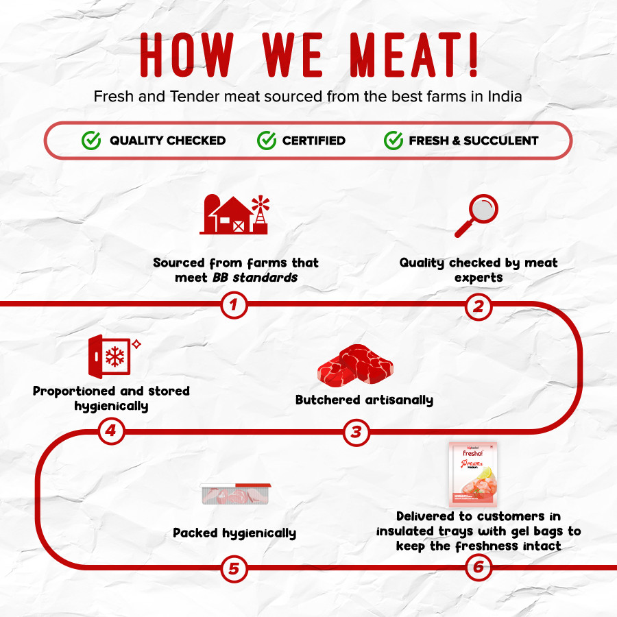 Fresho is our in-house brand of fresh meat, poultry, and seafood. We take utmost care in selecting the best suppliers to provide you with high quality and succulent products. Every product is stored in our cold storage right until your doorstep ensuring freshness and utmost hygiene.