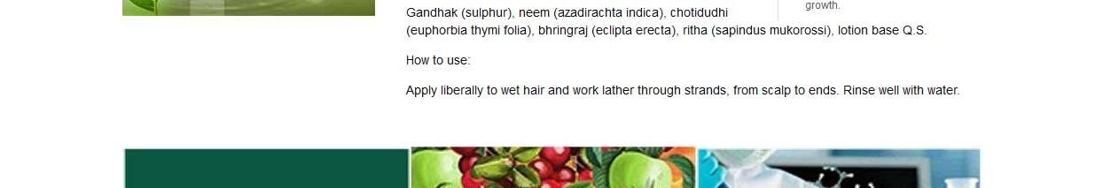 Gandhak (Sulphur), Neem (Azadirachta Indica), Chotidudhi (Euphorbia Thymi Folia), Bhringraj (Eclipta Erecta), Ritha (Sapindus Mukorossi), Lotion Base Q.S.