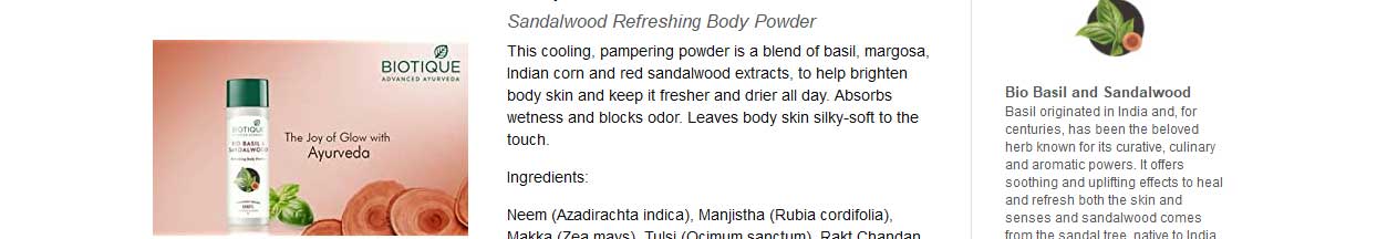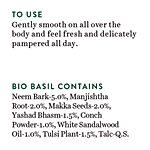 Biotique Basil and Red Sandalwood Body Talc is fine superior grade talc that gives a smooth, cooling effect to skin after bathing. It contains extracts of Margosa, Basil, Red Sandalwood along with Sandalwood powder. It provides day-long protection from perspiration and bad odour.