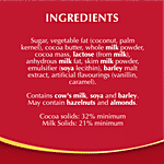 Sugar, Vegetable Fat (Coconut, Palm Kernel), Cocoa Butter, Whole Milk Powder, Cocoa Mass, Lactose (From Milk), Anhydrous Milk Fat, Skimmed Milk Powder, Emulsifier (Soya Lecithin), Barley Malt Extract (Gluten), Artificial Flavourings (Vanilla, Caramel).