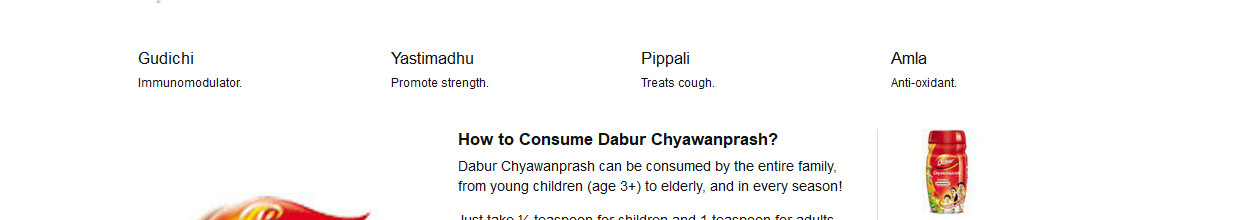 Do you think your child has inner strength? Do you worry that your child will fall ill? Do you feel that your child may miss school due to falling ill? Do you doubt that only tasty food is not enough for your child’s good health? If your answer to any of the above questions is yes, then Dabur Chyawanprash is the answer to your child’s health worries - A recipe used in Ayurveda since ancient times, Chyawanprash offers a wide range of health benefits. Dabur Chyawanprash provides strong immunity and good digestion for children and adults alike. Two spoons daily of Dabur Chyawanprash support immunity and is beneficial for overall health and wellbeing. It is also good for the digestive and respiratory systems. The primary action of Dabur Chyawanprash is to bolster the immune system and to support the body’s natural ability to fight illnesses. Amalaki (the main ingredient) aids in the elimination of ama (toxins). Therefore, regular use of Dabur Chyawanprash helps strengthen the body’s natural defence systems. It builds the essence of immunity, promoting systemic health and well-being. ingredients of Dabur Chyawanprash are scientifically validated for their beneficial effects on health. It is considered one of the best family tonics—suitable for all ages from young children to the elderly. (Children above 3 years of age).