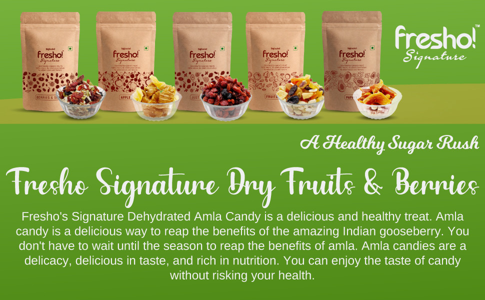 Fresho Signature presents an array of dry fruits apart from the ordinary to give you the best of the best to indulge. Want to try something other than a regular fruit? This sweetened amla dry fruit is a healthy alternative to munch on when hunger strikes. It contains amla fruit and sulphurless sugar. Easy to carry, it makes a great snack to keep you going throughout the day.Our candied dry fruit range is here to be your snack buddy and your healthy sugar high. It can also be used as some sweet goodness to your breakfast cereals, for baking, as dessert toppings and to make traditional sweets. They are sweetened with sulphurless sugar and liquid glucose to enhance the zing. There are 0 added preservatives, artificial colour and flavour to retain the original fruit essence and keep it natural and healthy.