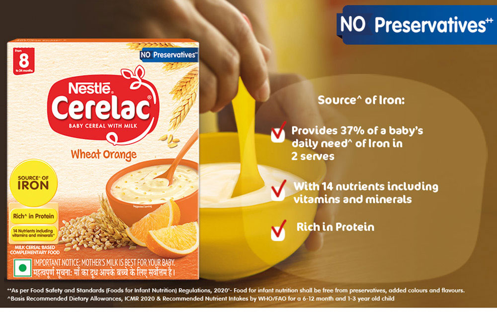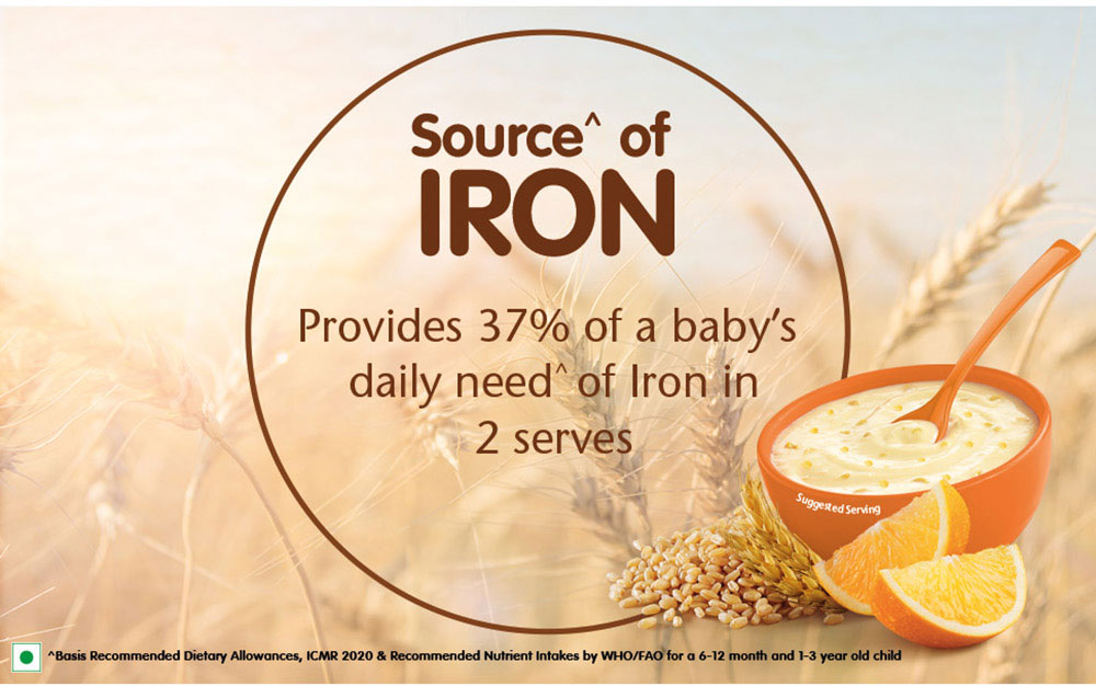 Nestlé Cerelac Baby Cereal with Milk is a complementary food for infants aged 8 to 24 months. As infants and young children have higher nutrient requirements than adults, two servings of Cerelac Wheat Orange Cereal provide 37% of a baby’s daily iron needs^. It is also a source of 14 essential nutrients, including vitamins and minerals. Vitamin A, Vitamin C, and Zinc help support a healthy immune system.