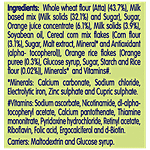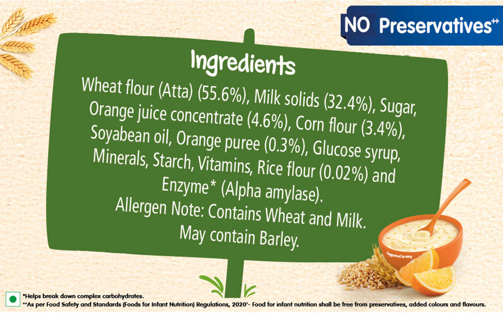 Ingredients: Wheat flour (Atta) (55.6%), Milk solids (32.4%), Sugar, Orange juice concentrate (4.6%), Corn flour (3.4%), Soyabean oil, Orange purée (0.3%), Glucose syrup, Minerals, Starch, Vitamins, Rice flour (0.02%) and Enzyme (Alpha amylase).