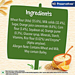 Ingredients: Wheat flour (Atta) (55.6%), Milk solids (32.4%), Sugar, Orange juice concentrate (4.6%), Corn flour (3.4%), Soyabean oil, Orange purée (0.3%), Glucose syrup, Minerals, Starch, Vitamins, Rice flour (0.02%) and Enzyme (Alpha amylase).