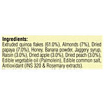 Extruded Quinoa Flakes (61.0%), Jaggery Syrup, Salt, Honey, Almonds (7.0%), Raisin (3.0%), Dried Papaya (7.0%), Dried Apple (3.0%), Dried Peach (3.0%), Banana Powder, Banana Flavour, Antioxidant (INS 320, Rosemary Extracts, INS 309).