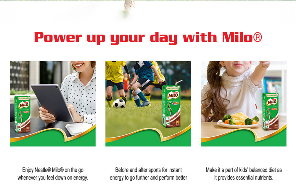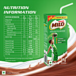Nestlé Milo is the world's leading chocolate malt beverage that provides essential energy for an active, healthy lifestyle. Combining the rich, delicious flavour of cocoa, malt, and milk, this nourishing drink is fortified with the goodness of B-Vitamins, protein, iron, and calcium to support healthy growth and development. Enjoy Milo hot or cold for a convenient, tasty, and nutritious treat suitable for all ages. Made with responsibly sourced ingredients, including Indian millet, Milo offers a unique international taste that kids love. With its creamy texture and energising properties, Milo is the perfect companion for regular sports and a balanced diet, helping you and your champion go further.