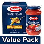 Barilla Durum Wheat Pasta- Penne Rigate 500 g Carton + Pasta Sauce- Arrabbiata 400 g Jar, Combo 2 Items