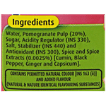 Water, Pomegranate Pulp (20%)*, Sugar, Salts, Acidity Regulator (ins 330), Stabilizer (ins 440), Anti Oxidant (ins 300), Spice And Spice Extracts (0.025%) - (cumin, Black Pepper, Capsicum, Ginger).