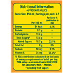 Per 100 ml (Approx.):• Energy: 60 kcal• Protein: 0.1 g• Carbs: 15 g• Fat: 0 g• Calcium: 1 mg• Iron: 0.1 mg• Natural fruit sugars: 3 g• Added sugar: 12 g.