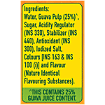 Water, guava pulp (24.9%), sugar, acidity regulator (INS 330), stabilizer (INS 440), antioxidant (INS 300) and salt.Contains added nature identical guava flavour.No added colour or preservatives.