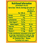 Per 100 ml (Approximate Values):• Energy: 60 kcal• Protein: 0.1 g• Carbohydrates: 15.3 g• Fat: 0 g• Calcium: 4 mg• Iron: 0.4 mg• B-Carotene: 300 ug• Natural fruit sugars: 5 g• Added sugar: 10 g.