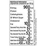 Energy - 900 Kcal; Carbohydrates, Protein - 0 g; Cholestrol - 0 g; Fat - 100 g; Saturated Fatty Acid NMT*- 16 g; Mono Unsaturated Fatty Acid NMT* - 22 g; Poly Unsaturated Fatty Acid NMT* - 2 g; Added Vitamin A @ 2500 I.U#/ 750 mcg**; Added Vitamin A @ 450 I.U#/ 11.25 mcg** (*NMT = Not more than, # I.U stands for International Units; **mcg stands for microgram; @ at the time of packing.