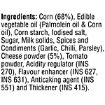 Corn (68%), Edible Vegetable Oil (Palmolein Oil / Corn Oil), Maltodextrine, Salt, Paprika Chilli, Flour (Wheat), Cheese Powder, Sugar, Milk Solids, Glucose Syrup, Spices (Garlic & Onion Powder), Flavouring, Natural Colour [Plain Caramel (INS 150a)], Anticaking Agent [Silicon Dioxide (INS 551)], Acidity Regulator [Lactic Acid (INS 270), Calcium Lactate (INS 327), Citric Acid (INS 330)].