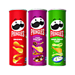 HOME>SNACKS & BRANDED FOODS>SNACKS & NAMKEEN>CHIPS & CORN SNACKS>PRINGLES Potato Chips - Sour Cream & Onion + Fusion Chutney + Classic Original, 102/107g