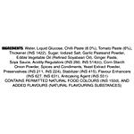 Water, Liquid Glucose, Chilli Paste(8.0%), Tomato Paste (6%), Thickener (INS 1422), Sugar, Iodized Salt, Garlic Paste And Powder, Edible Vegetable Oil (Refined Soyabean Oil), Ginger Paste, Soya Sauce, Acidity Regulators (INS 260, INS 514(Ii)), Corn Starch, Onion Powder, Spices And Condiments, Yeast Extract Powder, Preservative (INS 211, INS 224), Stabilizer (INS 415), Flavour Enhancers (INS 627, INS 631), Anticaking Agent (INS 551)