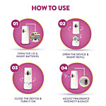 ‘Summer delights’; a unique fragrance that blends scents of fresh white florals, sweet melon, and subtle vanilla, to fill your home with sweet and aromatic fragrances. One Airwick Freshmatic refill provides up to 70 days of fragrance (on ‘low’ setting on the device). For the best results, use only Airwick Freshmatic Refills with the Airwick Freshmatic Device. The Airwick Freshmatic device automatically releases bursts of continuous fresh fragrance, so that your home always smells beautiful. There are three intensity settings available on the device - High, Medium & Low to regulate the frequency of sprays.