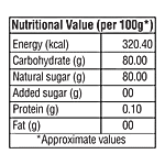 Nutrition per gram/ml: 100g Energy (kcal): 320.40 Carbohydrate (g): 80.00 Natural sugar (g): 80.00 Added sugar (g): 0.00 Protein (g): 0.10 Fat (g): 0.00