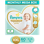 New Pampers Premium Care Pants with 360-degree cottony softness give your baby the ultimate comfort all day, all night long. Pampers Premium Care Pants contain soothing lotion with Aloe Vera to protect your baby's skin from rashes, while its 10 million micropores allow your baby's skin to breathe. Its 12-hour leak lock facility keeps your baby dry and away from wetness. Experience 5-Star comfort with unique added features like Wetness Indicator which turns Yellow to Blue indicating when you may change the diaper and a Disposal Tape to help you with easy disposal. Pampers Premium Pants are available in New-born (NB), S, M, L, XL and XXL sizes.