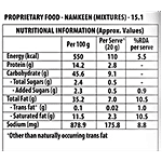Refined Palmolein, Bengal gram (21.5%), Peanut (15.9%), Lentil (13.8%), Besan, Flaked Rice (4.8%), Seasoning Mix {Spices and Condiments, Iodized Salt, Black Salt, Dehydrated Kachri and Dehydrated Yellow Chilli}, Starch, Rice Flour, Iodized Salt, Turmeric Powder and Spinach Powder. Used as a flavouring agent.