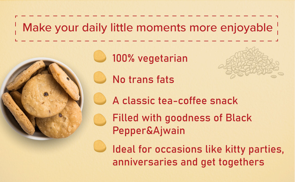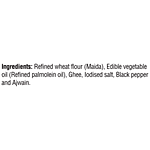 Refined Wheat Flour (Maida), Edible Vegetable Oil (Refined Pamolein Oil), Ghee, Iodised Salt, Black Pepper and Ajwain.