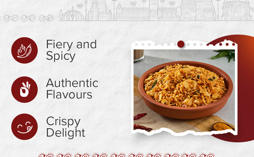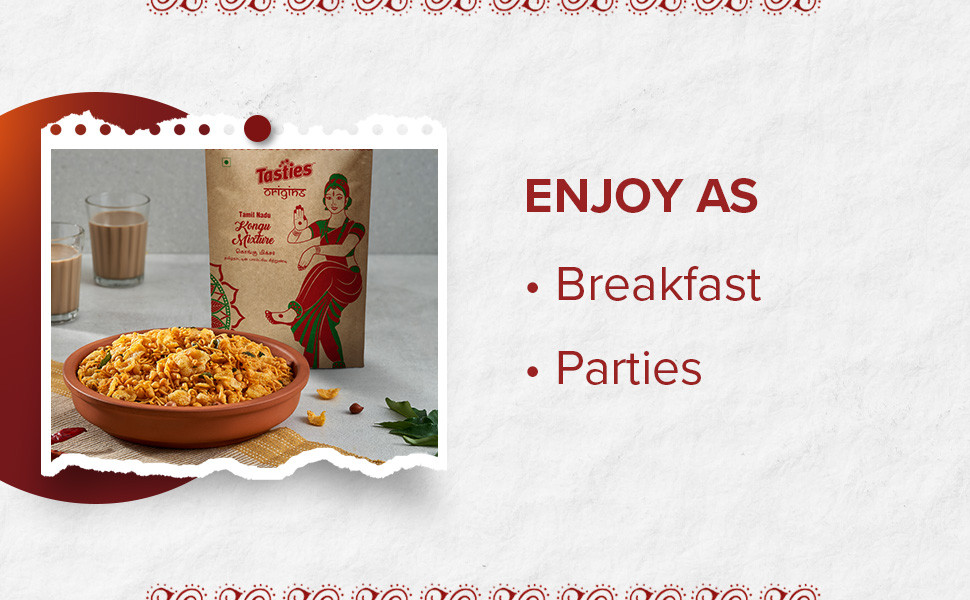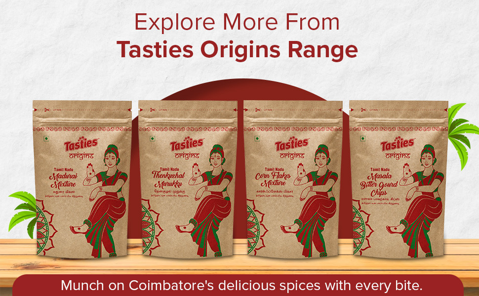 About the ProductNamkeen - Kongu Mixture, Authentic Coimbatore Speciality Flavours, Savoury Snack is the snack you need to satisfy your hunger pangs and cravings and is the perfect munchie to carry with you everywhere. Perfectly blended with fresh and local spices just the way you like it, our snacky treats come with a spicy and sweet tadka and are naturally processed with the finest split chickpea flour and blended well with corn flakes, red lentils, and red chilli powder. Our Namkeen - Kongu Mixture, Authentic Coimbatore Speciality Flavours, Savoury Snack treat is a traditional recipe that you can revel in at any time of the day and is sure to make your tastebuds dance. A natural energy booster, our savoury and sweet treat is best accompanied by any beverage of your choice and is ready to eat. Packed with nutrition, our Namkeen - Kongu Mixture, Authentic Coimbatore Speciality Flavours, Savoury Snack has no added preservatives and no trans-fat and is the best snack to have in your pantry. Indulge in savour goodness with our Namkeen - Kongu Mixture, Authentic Coimbatore Speciality Flavours, Savoury Snack now! Experiment with the eclectic range of Tasties Origin's Namkeen collections on Big Basket from Lahsun Sev, Indori Mixture, and more, where tradition meets flavour in local recipes.