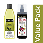 Soulflower Cold Pressed Olive Oil, 225 ml + Onion Herbal Hair Growth Oil, 220 ml, Combo 2 Items