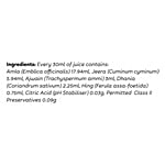 Every 30ml Of Juice Contains: Amla (Emblica Officinalis) 17.94ml, Jeera (Cuminum Cyminum) 5.94ml, Ajwain (Trachyspermum Ammi) 3ml, Dhania (Coriandrum Sativum) 2.25ml, Hing (Ferula Assa-Foetida) 0.75ml, Citric Acid (Ph Stabiliser) 0.03g, Permitted Class II Preservatives 0.09g.