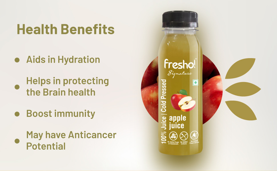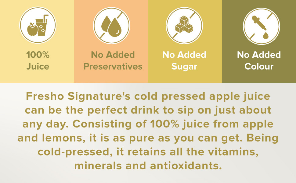 About the ProductFresho Signature's Cold Pressed Apple Juice can be a perfect drink you sip on a sunny day. Consisting of 100% juice from apples and lemons, this drink has zero artificial colour, preservatives, or sweeteners. Additionally, it is trans fat and cholesterol-free, so you can enjoy the drink without any guilt. Made using cold-pressed methods to retain more of the vitamins, minerals and antioxidants from the fruit, this drink is flavourful, fruity and healthier than regular juice.