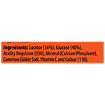 Sucrose (56%), Glucose (40%), Acidity Regulator (330), Minerals (Calcium Phosphates), Common Edible Salt, Vitamin C, Colour (110). (Contains Permitted Synthetic Food Colour And added Flavour (Natural Identical Orange Flavouring Substances).