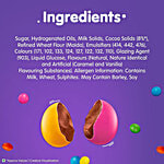 Sugar, Hydrogenated Oils, Milk Solids, Cocoa Solids (8%*), Refined Wheat Flour (Maida), Emulsifiers (414, 442, 476), Colours (171, 102, 133, 124, 127, 122, 132, 110), Glazing Agent (903), Liquid Glucose, Cocoa Butter, Flavours (Natural, Nature Identical and Artificial (Caramel and Vanilla) Flavouring Substances). Allergen Information: Contains Milk, Wheat, Sulphites. May Contain: Soy.