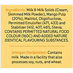 Milk & Milk Solids, Mango Pulp (20%), Maltitol, Fructooligosaccharide, Permitted Emulsifier (471, 433), Stabilizer (412, 407, 461), Stevia