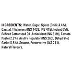 Water, Red Chilli, Sugar, Garlic, Sunflower Oil, Tomato Paste, Salt, Corn Starch, Acetic Acid (Acidifying Agent, E260), Sesame Seeds, Xanthan Gum (Emulsifying & Stabilising Agent, E415), Sodium Benzoate (Preservative, E211), Spices (celery, cumin, ginger, clove, cinnamon).