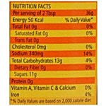 Nutrition per gram/ml: 100g Serving Size: 2 Tbsp (36g) Energy: 50 Kcal Total Fat: 0g Saturated Fat: 0g Trans Fat: 0g Cholesterol: 0mg Sodium: 340mg Total Carbohydrates: 13g Dietary Fiber: 0g Sugars: 11g Protein: 0g Vitamin A: 0% Vitamin C: 0% Calcium: 0% Iron: 4%